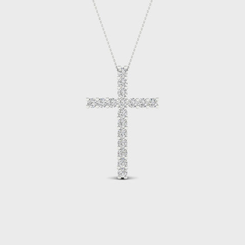 This classic round created diamond cross pendant is crafted in 14KT gold and set with E-F color, VS clarity diamonds. The clean silhouette shines with quiet brilliance, suspended from a refined 18" box chain and secured with a spring ring clasp. Understated & elevated.