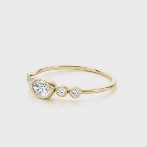 Delicate and refined, this Oval Milgrain 5 Stone Diamond Band is the essence of modern romance. Crafted in 14K gold, it features a 1/4 carat oval center diamond framed by intricate milgrain detail. Accented with four smaller round brilliant diamonds totaling 1/15 carat. The milgrain detailed bezel setting adds a soft, vintage-inspired touch while maintaining a sleek, contemporary profile. Perfect for stacking or worn solo, it’s an effortlessly elegant piece that glows with subtle sophistication.